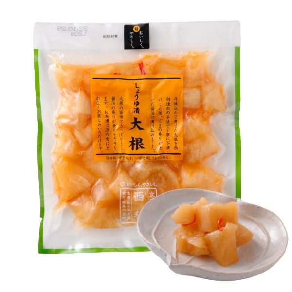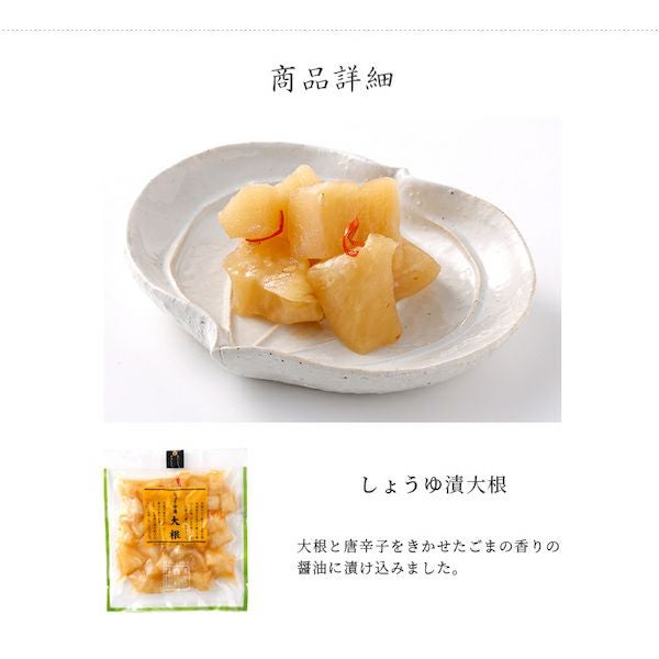 原材料 大根、漬け原材料(糖類(砂糖、オリゴ糖)、調味酢、発酵調味料、醤油、ごま油、食塩、昆布エキス、ごま、唐辛子、昆布)/ 調味料(アミノ酸)、ソルビトール、酸味料、乳化剤 、(一部に大豆・小麦・ごまを含む)