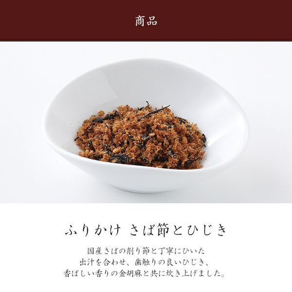 | 原材料 | さば節(国内製造)、ひじき、醤油、砂糖、本みりん、昆布だし、椎茸だし、ごま、金胡麻 、(一部に小麦・ごま・さば・大豆を含む) |