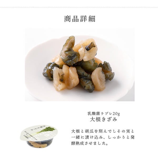 | 原材料 | 大根、胡瓜、しその実、生姜、漬け原材料(発酵調味料、醤油、醸造酢、カツオ節風味調味料、食塩、ラブレ乳酸菌液)/ 調味料(アミノ酸)、ソルビトール、香料 、(一部に小麦・大豆・ゼラチンを含む) |