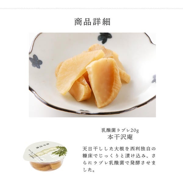 | 原材料 | 本干大根、漬け原材料(ぬか類、食塩、茄子の葉、柿の皮、ラブレ乳酸菌液、唐辛子)/ 調味料(アミノ酸等) 、(一部に大豆を含む) |
