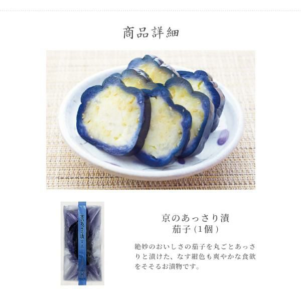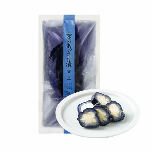 絶妙なおいしさの茄子を丸ごとあっさりと漬けた、なす紺色も爽やかな食欲をそそるお漬物です。