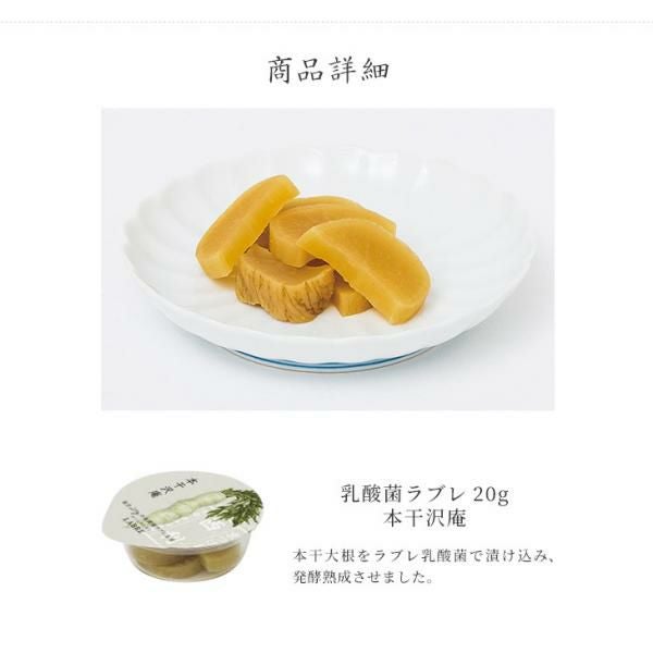 | 原材料 | 本干大根、漬け原材料(ぬか類、食塩、茄子の葉、柿の皮、ラブレ乳酸菌液、唐辛子)/ 調味料(アミノ酸等) 、(一部に大豆を含む) |