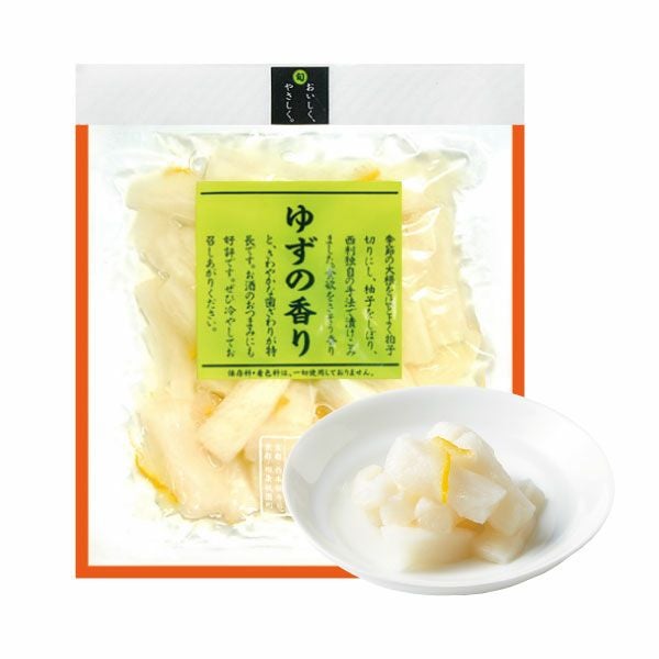 | 原材料 | 大根、漬け原材料(発酵調味料、食塩、ゆず果汁、醸造酢、ゆずの皮)/ソルビトール、調味料(アミノ酸等)、酸味料、酸化防止剤(ビタミンC)、ミョウバン、香料、香辛料 、(一部に小麦・大豆を含む) |