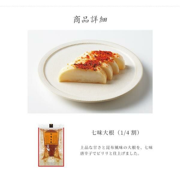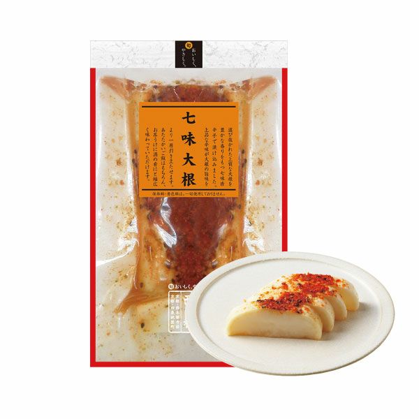 | 原材料 | 大根、漬け原材料(調味酢、糖類(砂糖、オリゴ糖)、発酵調味料、食塩、七味唐辛子、昆布エキス、昆布)/ 調味料(アミノ酸)、ソルビトール、酸味料 、(一部にごまを含む) |