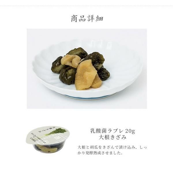 | 原材料 | 大根、胡瓜、しその実、生姜、漬け原材料(発酵調味料、醤油、醸造酢、カツオ節風味調味料、食塩、ラブレ乳酸菌液)/ 調味料(アミノ酸)、ソルビトール、香料 、(一部に小麦・大豆・ゼラチンを含む) |