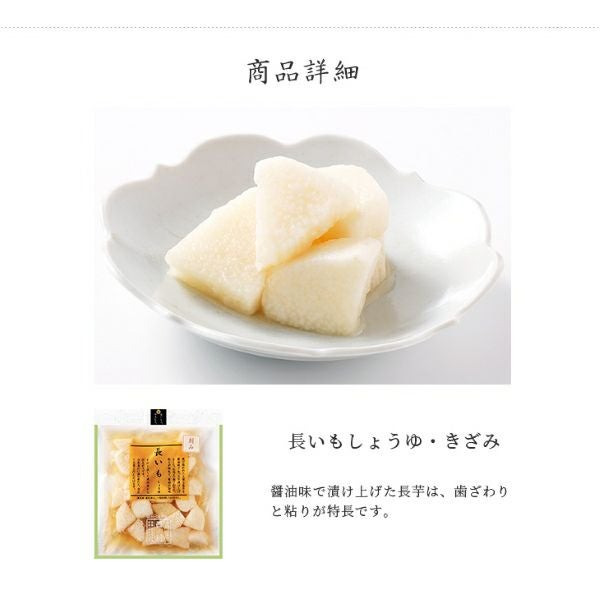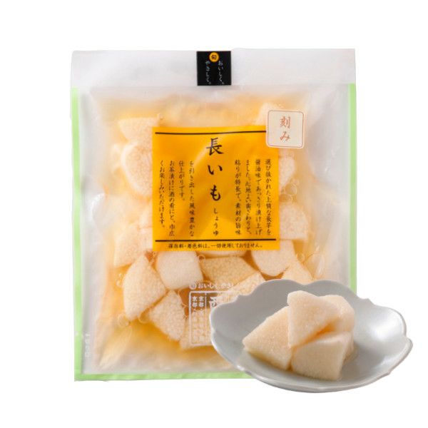 | 原材料 | 長いも、漬け原材料(醤油、発酵調味料、カツオ風味調味料)/ 調味料(アミノ酸等)、酸味料 、(一部に大豆・小麦・乳成分・やまいもを含む) |