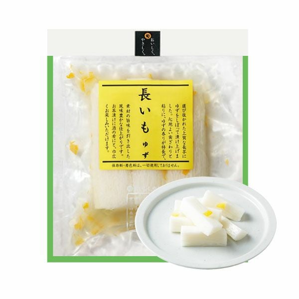 | 原材料 | ながいも、漬け原材料(醤油、みりん、醸造酢、ゆずの皮、食塩、ゆず果汁)/ 調味料(アミノ酸)、酸味料 、(一部に大豆・小麦・やまいもを含む) |