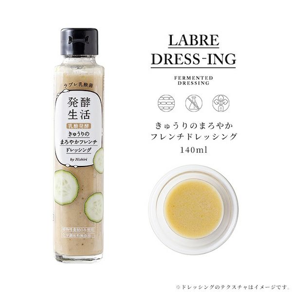 | 原材料 | オリーブオイル、はちみつ、オニオンソテー、醸造酢、きゅうり(ラブレ乳酸菌発酵)、ねりごま、塩漬けきゅうり、食塩、香辛料、酵母エキスパウダー / アルコール、増粘剤(タマリンド)、 (一部にごま・大豆を含む) |