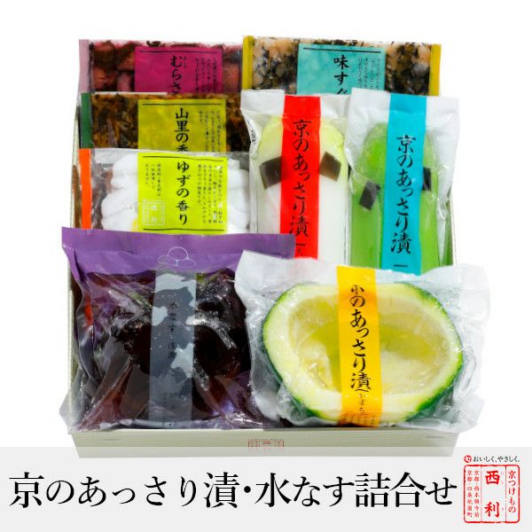 京のあっさり漬(大根1/4割・かぼちゃ半割・瓜1/4割)、水なす浅漬1個、味すぐき40g、赤しそむらさきの50g、山里の香り40g、ゆずの香り50g