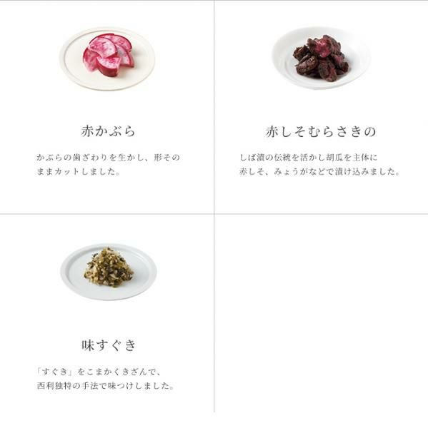 千枚漬70g×2、京のあっさり漬(大根 1/4割・茄子1個)、赤かぶら80g、赤しそむらさきの50g、味すぐき40g