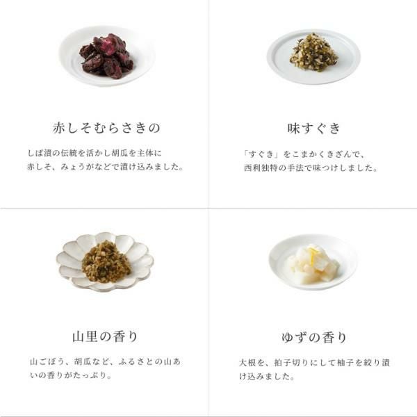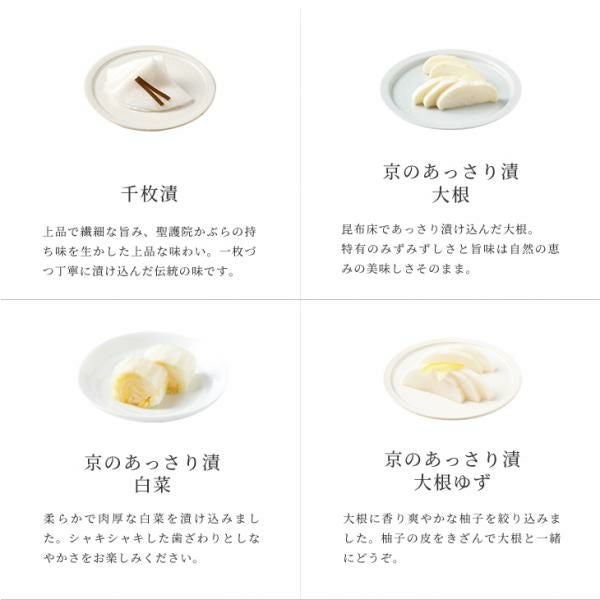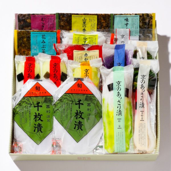 千枚漬70g×2、京のあっさり漬(大根 1/4割×2・大根柚子1/4割・白菜223g・茄子1個・日野菜1本×2)、赤かぶら80g、赤しそむらさきの50g、味すぐき40g、山里の香り40g、ゆずの香り50g、花みぶ菜40g、味みぶ菜90g