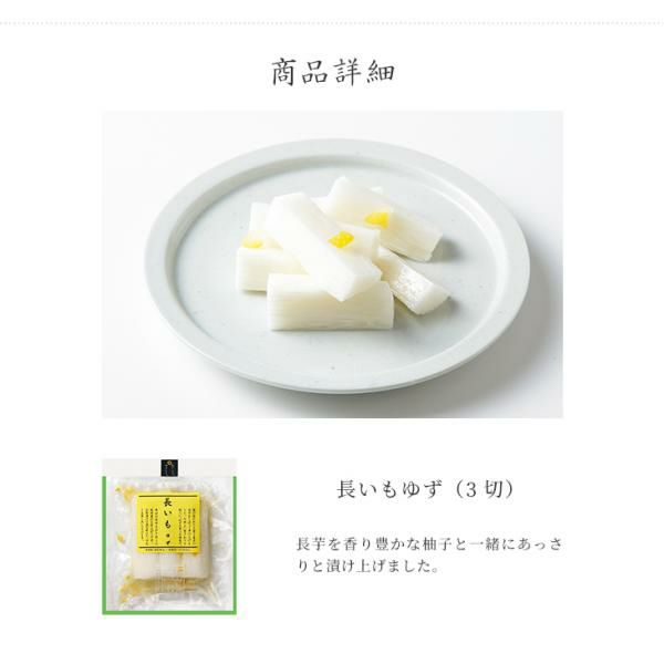 | 原材料 | ながいも、漬け原材料(醤油、みりん、醸造酢、ゆずの皮、食塩、ゆず果汁)/ 調味料(アミノ酸)、酸味料 、(一部に大豆・小麦・やまいもを含む) |