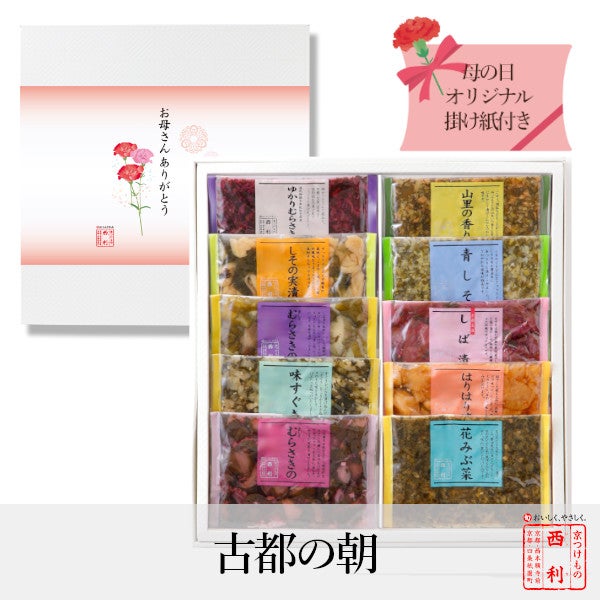 赤しそむらさきの50g、青しそむらさきの50g、はりはり漬50g、青しそ50g、しその実漬40g、しば漬50g、味すぐき40g、山里の香り40g、花みぶ菜40g、ゆかりむらさき40g
