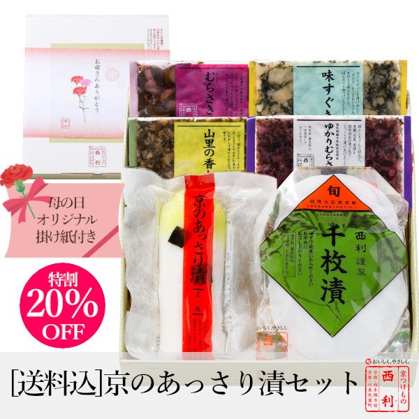 千枚漬70g、京のあっさり漬(大根 1/4割)、ゆかりむらさき40g、山里の香り40g、味すぐき40g、赤しそむらさきの50g