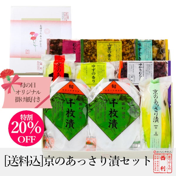 千枚漬70g×2、京のあっさり漬(大根 1/4割・白菜223g)、ゆずの香り50g、ゆかりむらさき70g、赤しそむらさきの50g、味すぐき40g、山里の香り40g