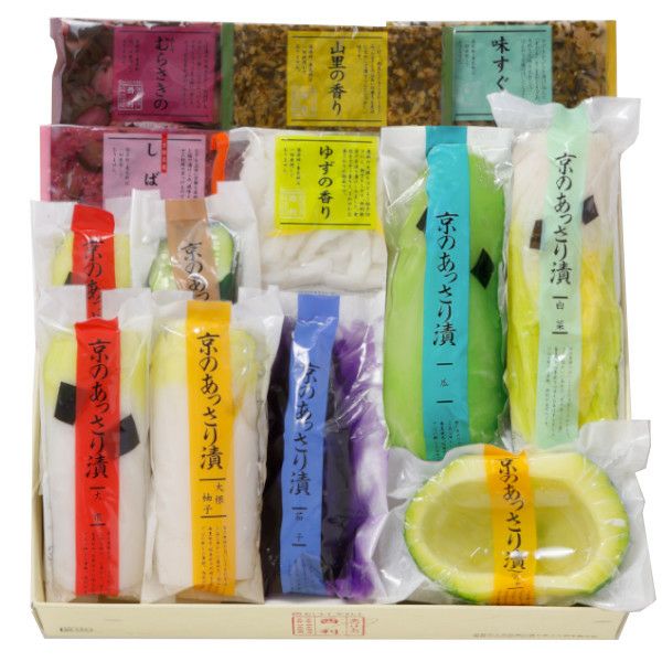 京のあっさり漬(大根1/4割・大根柚子1/4割・かぼちゃ半割・瓜半割・白菜223g・四葉胡瓜2切)、水なす浅漬1個、ゆずの香り50g、山里の香り40g、味すぐき40g、赤しそむらさきの50g、しば漬50g