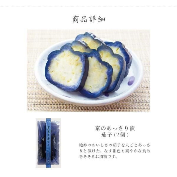 | 原材料 | 茄子、漬け原材料(食塩、アミノ酸液、醸造酢、かつお節調味エキス)/ ソルビトール、調味料(アミノ酸等)、酸味料、ミョウバン、酸化防止剤(ビタミンC)、 (一部に大豆を含む) |