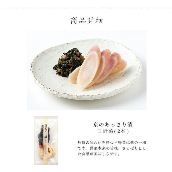 | 原材料 | 日野菜、漬け原材料(調味酢、糖類(砂糖、オリゴ糖)、発酵調味料、食塩、昆布エキス、昆布)/ 調味料(アミノ酸)、ソルビトール、酸味料 |