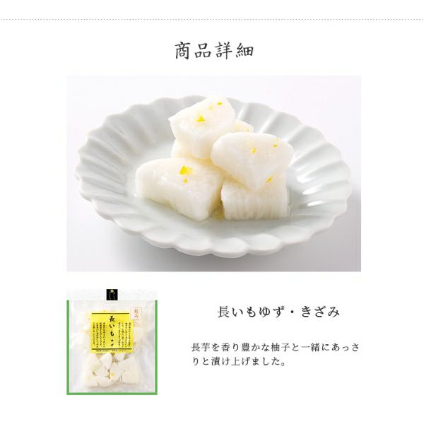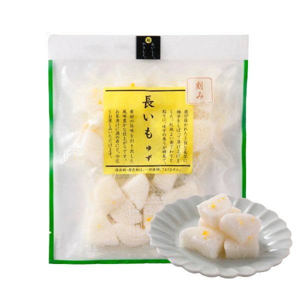 | 原材料 | 長いも、漬け原材料(醤油、みりん、醸造酢、ゆずの皮、食塩、ゆず果汁)/ 調味料(アミノ酸)、酸味料 、(一部に大豆・小麦・やまいもを含む) |