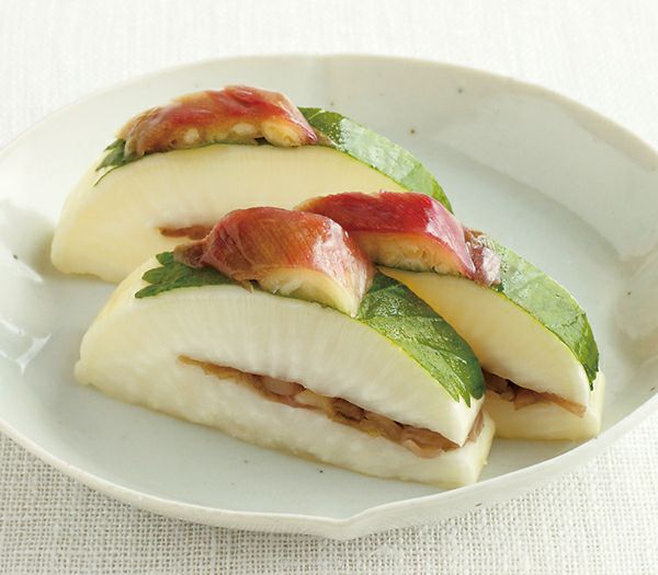 大根に、きざんだ茗荷と大葉を添えて一緒にどうぞ。