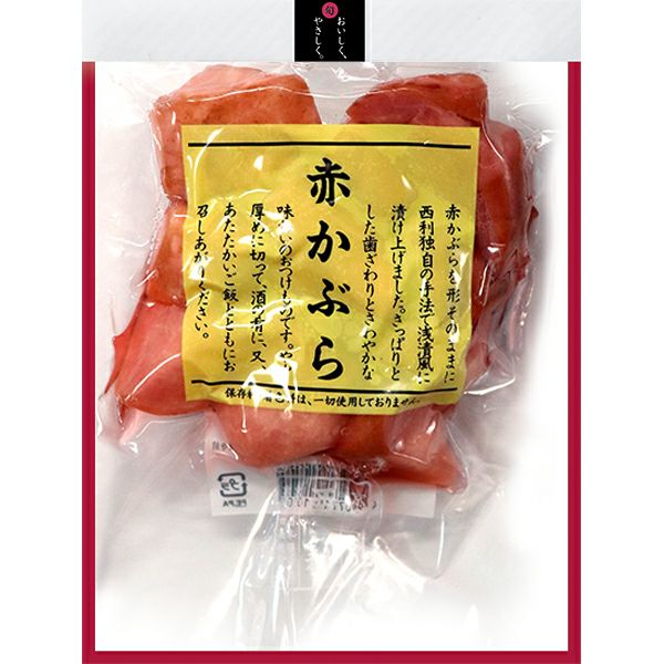 | 原材料 | 赤かぶら、漬け原材料(みりん、醸造酢、食塩)/ ソルビトール、調味料(アミノ酸) |