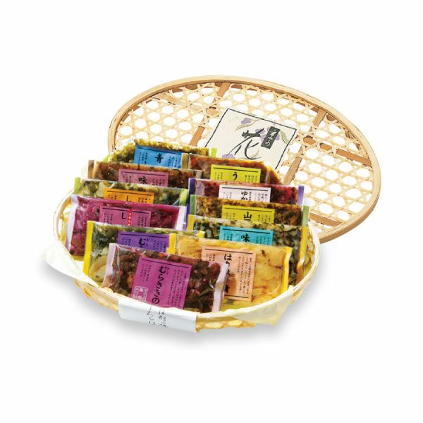 赤しそむらさきの50g、味すぐき40g、はりはり漬50g、味しば漬40g、青しそむらさきの40g、しば漬50g、ゆかりむらさき40g、山里の香り40g、しその実漬40g、うり山椒40g、青しそ50g