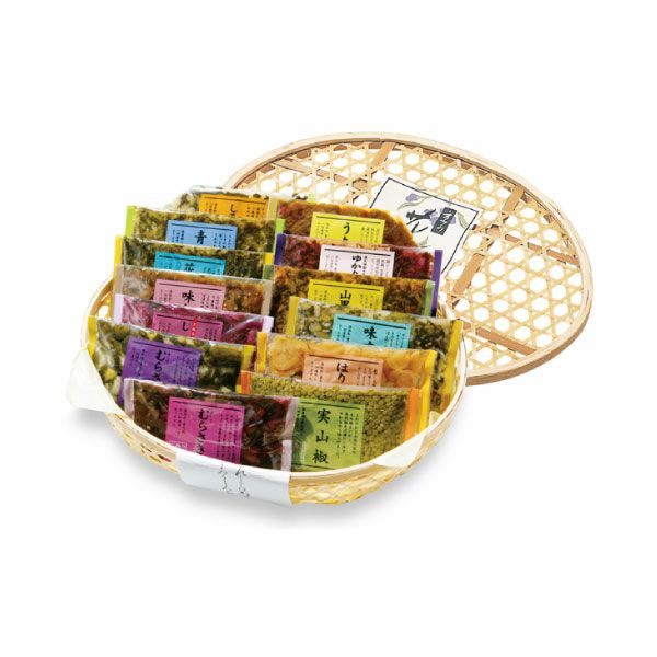 赤しそむらさきの80g、味すぐき70g、はりはり漬50g、味しば漬70g、青しそむらさきの40g、しば漬50g、ゆかりむらさき70g、山里の香り70g、しその実漬40g、うり山椒40g、花みぶ菜70g、青しそ50g、実山椒30g