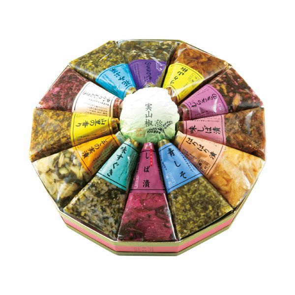 赤しそむらさきの80g、青しそむらさきの40g、しば漬50g、味しば漬40g、山里の香り70g、はりはり漬50g、青しそ80g、花みぶ菜70g、ゆかりむらさき70g、実山椒30g、味すぐき70g、しその実漬40g、うり山椒40g