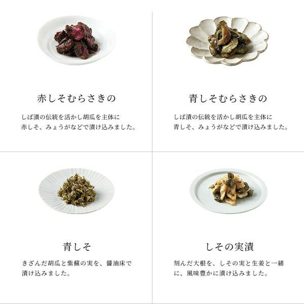 赤しそむらさきの80g、青しそむらさきの40g、青しそ50g、しその実漬50g、味すぐき40g、はりはり漬50g、味しば漬40g、しば漬50g、山里の香り40g、うり山椒40g