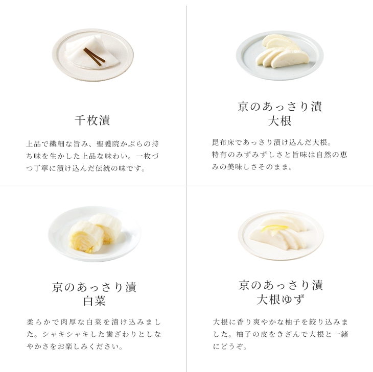 千枚漬70g×2、京のあっさり漬(大根 1/4割・大根柚子1/4割・白菜223g・茄子1個・日野菜1本)、赤かぶら80g、赤しそむらさきの50g、味すぐき40g、ゆずの香り50g