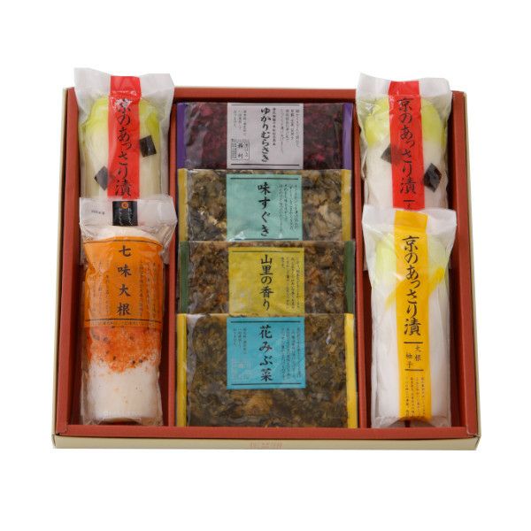 京のあっさり漬(大根1/4割×2・大根柚子1/4割)、七味大根1/4割、ゆかりむらさき70g、山里の香り40g、花みぶ菜40g、味すぐき40g