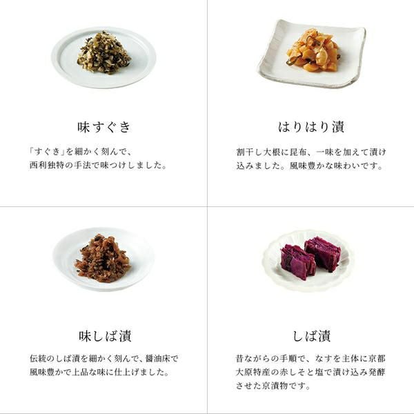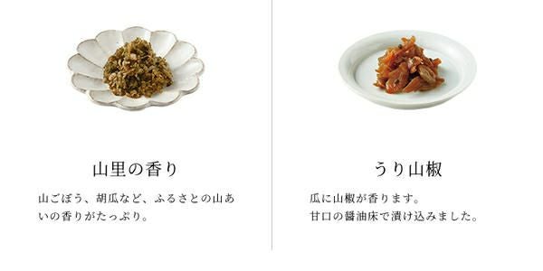 赤しそむらさきの80g、青しそむらさきの40g、青しそ50g、しその実漬50g、味すぐき40g、はりはり漬50g、味しば漬40g、しば漬50g、山里の香り40g、うり山椒40g