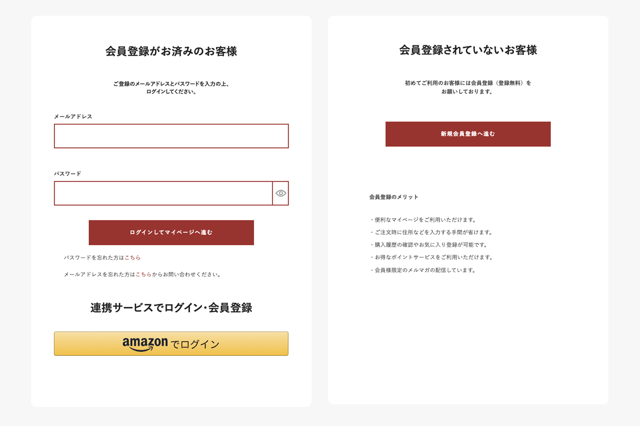 「Amazonアカウントでお支払い」ボタンから、Amazon.co.jpに登録しているEメールアドレスとパスワードでログインして、配送先とクレジットカード情報を選択するだけでお買い物できます。