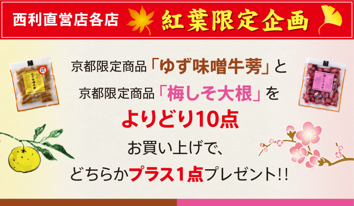 京都限定商品「ゆず味噌牛蒡」と「梅しそ大根」をよりどり10点お買い上げのお客様へ、どちらかお好きな商品をさらに1点プレゼントいたしております。