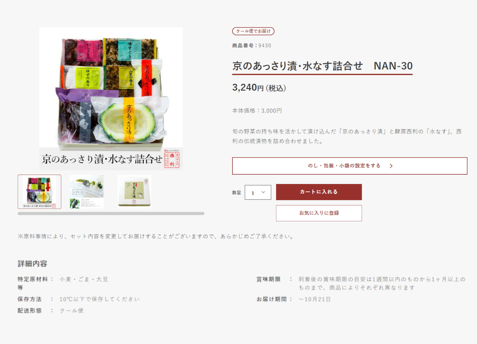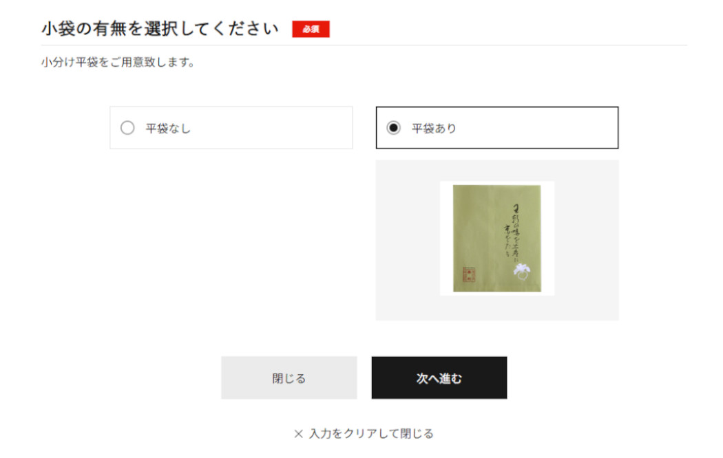 商品をカートに追加する前に「のし・包装・小袋の設定をする」ボタンからのし等をお選びください。