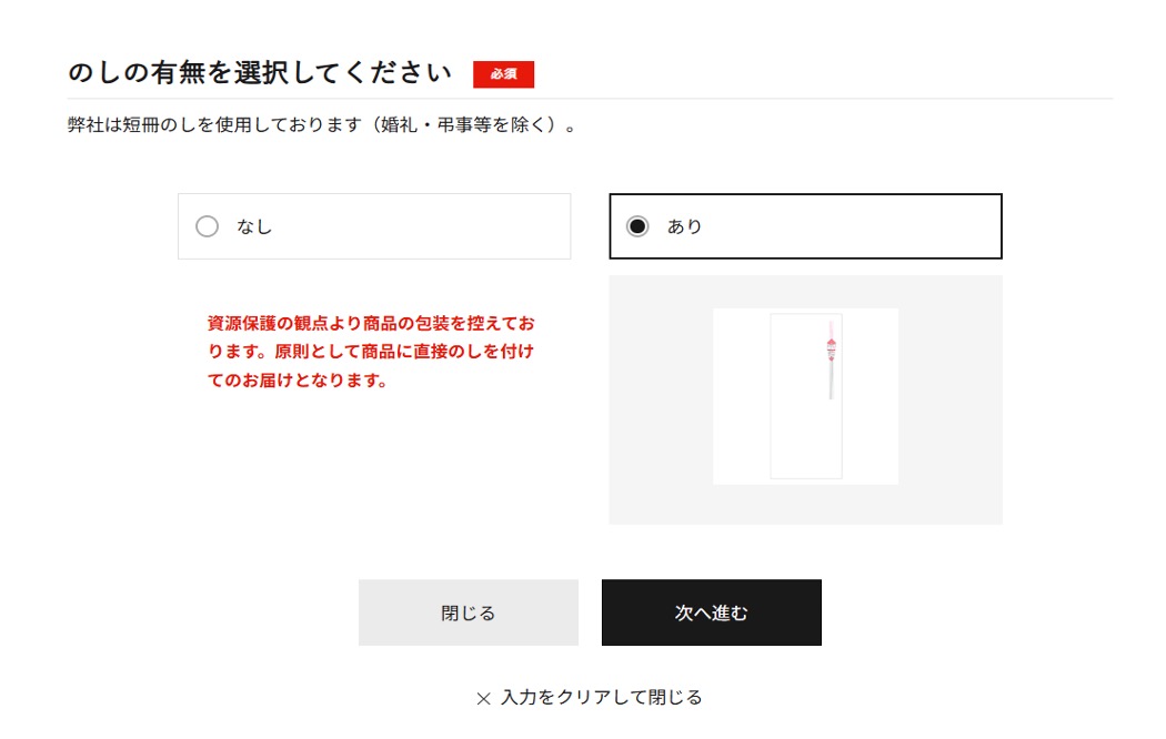 ※同一商品でののしの内容が異なる場合は、1つ目の商品ののしの設定を行い、カートに追加してから、次ののしの内容にて設定し、カートへ追加してください。